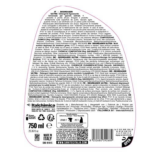 CONTENUTO - A casa riceverete 6 flaconi di Degreaser Ultra da 750 ml ciascuno. È un detergente alcalino ad alta concentrazione che rimuove grasso, olio e residui carbonizzati in modo efficace, rilasciando una dolce profumazione di limone nell'ambiente. PH 10,5 +/- 0,5. Idoneo all'impiego nei piani H.A.C.C.P.