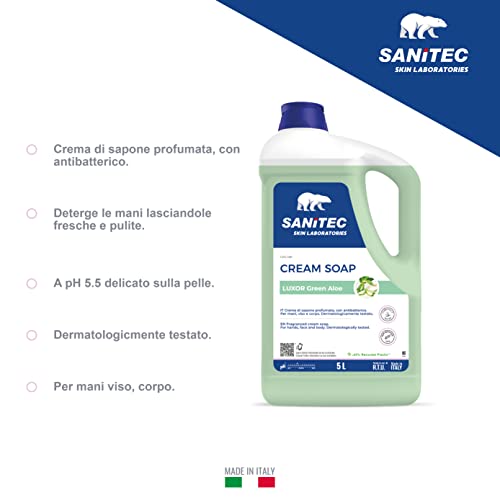 Sanitec, Luxor Green Aloe, Crema di Sapone Profumata Idratante e Antibatterico, Deterge le Mani Lasciandole Fresche e Pulite, pH 5,5, Dermatologicamente Testato, 5L 5000ml