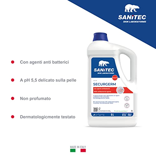 Sanitec, Securgerm, Sapone Liquido Igienizzante per le Mani, Detergente Liquido con 2 Antibatterici a pH 5.5, Dermatologicamente Testato, Made in Italy, Non profumato, 1 flacone da 5L 5000ml