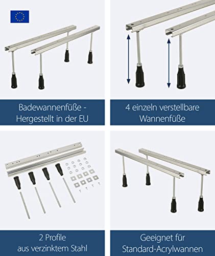 ➤ Piedistallo universale: Adatto per tutte le comuni vasche da bagno in acrilico Quattro piedini Altezza regolabile: 175 - 230 mm Due profili a C zincati In metallo Stabile Resistente