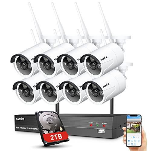 SANNCE NVR Telecamera di sorveglianza WiFi per esterni, 8 CH con 8 telecamere wireless WiFi da 2 MP, visione notturna a infrarossi, IP66 resistente alle intemperie, 2 TB hard disk