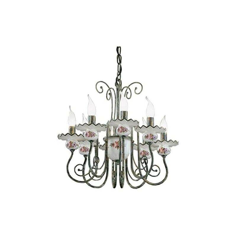 Decisamente nostalgica la linea Sanremo che evoca il passato, quando l'illuminazione degli ambienti era affidata alla luce fioca delle candele. Ottone verniciato ed anticato e decorazioni floreali manuali rendono ogni lampada un gioiello. Altezza: 52 Cm Diametro: 72 Cm