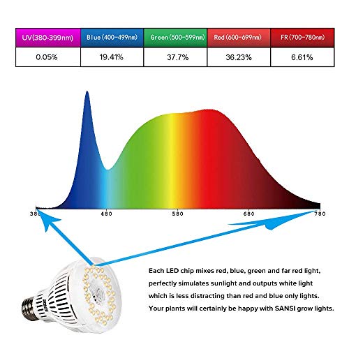【Spettro completo】 Rispetto ad altre luci di crescita, ciascuno dei chip a led SANSI emette tutte le lunghezze d'onda della luce, che possono essere completamente assorbite dalla fotosintesi delle piante senza sprechi, a differenza di ciò che fa una luce fluorescente. Questa lampada funziona per diverse fasi di crescita delle piante, poiché il raggio blu (400-499 nm) è buono per foglie più alte e sane e il raggio rosso (600-699 nm) per fioritura e frutti