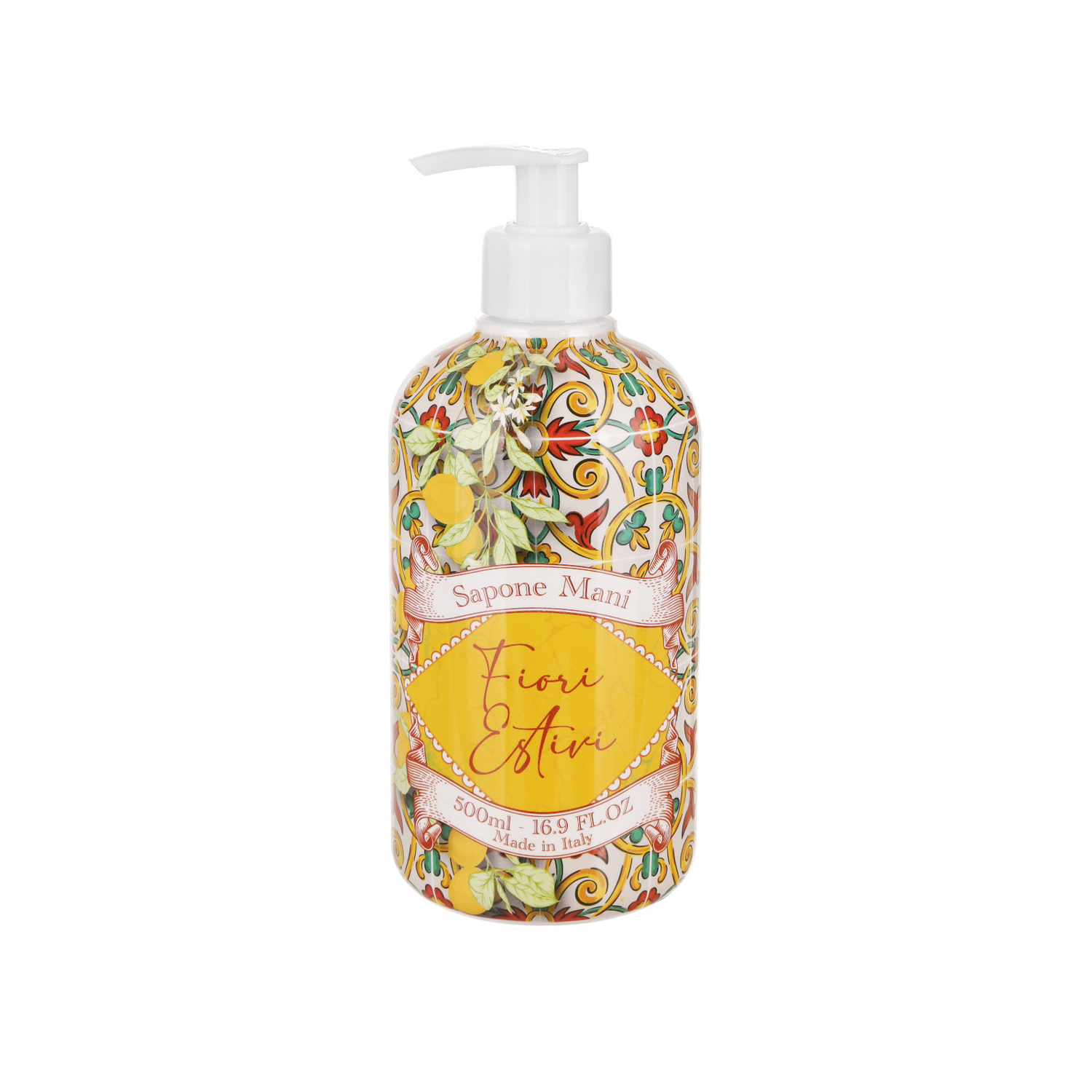Sapone per le mani della linea Agrumi con confezione dalla grafica accattivante ispirata alle maioliche e ai limoni del Mediterraneo. Il suo design originale e colorato si presta per essere posizionato in bella vista accanto al lavandino in bagno, sempre pronto all'uso. La profumazione ai fiori estivi sarà delicata sulla pelle e lascerà le tue mani profumate e idratate ogni giorno. Grazie al dosatore integrato non rischierai di sprecare nemmeno una goccia! Quantità: 500 ml. Ingredienti: Aqua, Sodium laureth sulfate, sodium chloride, parfum, cocamidopropyl, betaine,benzyl salicylate, hexyl, cinnamal, glycerin, limonene, citronellol, benzyl alcohol, citric acid, methylchloroisothiazolinone, methylisothiazolinone.