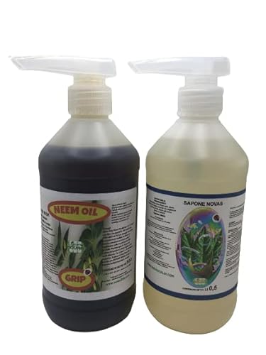 Sapone Novas + Grip Neem Oil agiscono immediatamente appena applicati. Anti acaro, anti cocciniglia,afidi o pidocchi delle piante, cimici, pulci, zecche, blatte, scarafaggi, larve e adulti di zanzare, ecc.