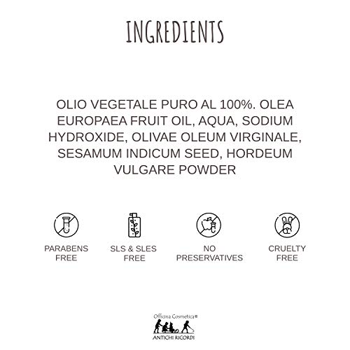 Il nostro sapone è realizzato in modo artigianale, saponificato a freddo come si faceva anticamente, realizzato con olio extravergine di oliva, senza conservanti, parabeni né olio di palma e stagionato in maniera naturale, rispettando i lenti tempi di asciugatura;