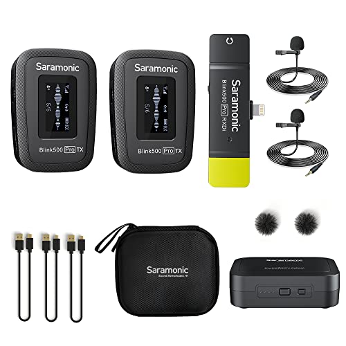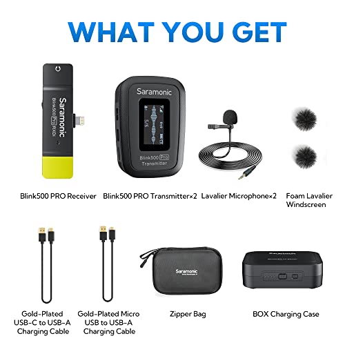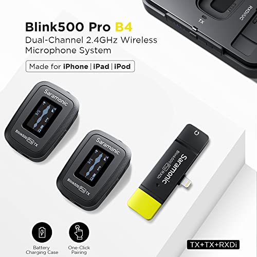 ❤ Sistema Saramonic Blink500 Pro - Microfono lavalier wireless incredibilmente leggero e ultracompatto per la fotocamera del telefono che utilizza 2 persone. Blink500 Pro B4 è un sistema a doppio microfono wireless con 1 ricevitore Apple Lightning certificato MFI e 2 trasmettitori, perfetto per iOS iPhone Registrazione audio video Facebook YouTube Podcast Vlog Intervista.