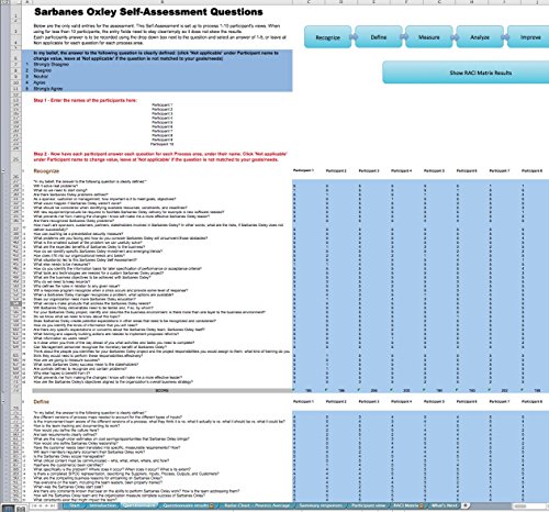 Sarbanes Oxley Self-Assessment ensures you don't miss anything: More than 640 critical Sarbanes Oxley success criteria in 7 RDMAICS (Recognize, Define, Measure, Analyze, Improve, Control and Sustain) steps with easy and quick navigating and answering for one or multiple participants