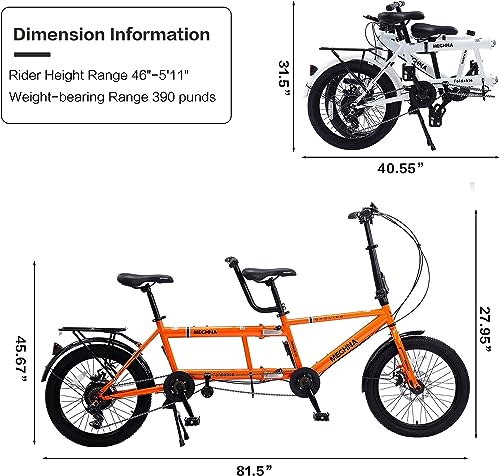 Bicicletta pieghevole: questa bicicletta per tre persone misura 207 cm di lunghezza e 116 cm di altezza. Una volta piegato, le sue dimensioni si riducono a soli 103 cm di lunghezza e 80 cm di altezza. Pesa circa 60 libbre e ha una dimensione della ruota di 20 pollici. Le sue dimensioni compatte facilitano la conservazione nel bagagliaio dell'auto, garantendo un comodo trasporto.