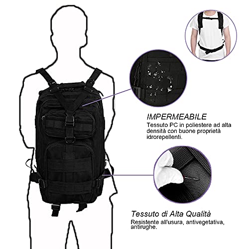 【Materiali di Alta Qualità】 Zaini tattico militare sono realizzati con tessuti ad alta densità, resistenti e resistenti all'usura, non facili da rompere e proteggono gli oggetti nello zaino. È molto adatto per le attività all'aperto. (Non completamente impermeabile, non può prevenire forti piogge o umidità a lungo termine)