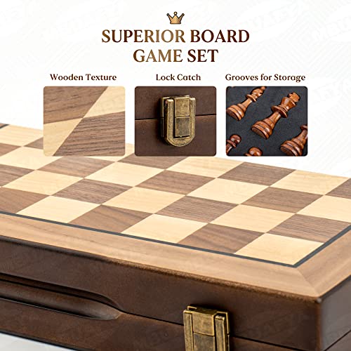 Pacchetto include: il nostro set di giochi in legno include 32 pezzi degli scacchi e 24 pezzi della scacchiera e misura 13 "x 6,6" x 2,6 "quando piegato (33 * 17 * 6,5 CM), è comodo per uso interno ed esterno.