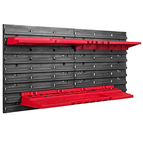 Porta attrezzi: 1 supporto per trapano e punte, in plastica rossa. Dimensioni: 190 x 111 x 32 mm. 1 supporto per cacciaviti in plastica rossa. Dimensioni: 190 x 111 x 32 mm. 1 grande portautensili universale in formato M, in plastica rossa. Dimensioni: 384 x 111 x 50 mm. 1 x grande portautensili universale in formato XXL, in plastica rossa. Dimensioni: 580 x 158 x 67 mm, 2 x pannelli da parete da 385 x 390 mm.