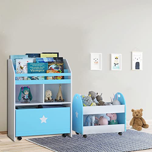 Scaffale per Giocattoli Contenitore Portagiochi con Ruote Porta Giocattoli per libri riviste giocattoli Scaffale per Cameretta e Stanza dei Giochi (Blu)