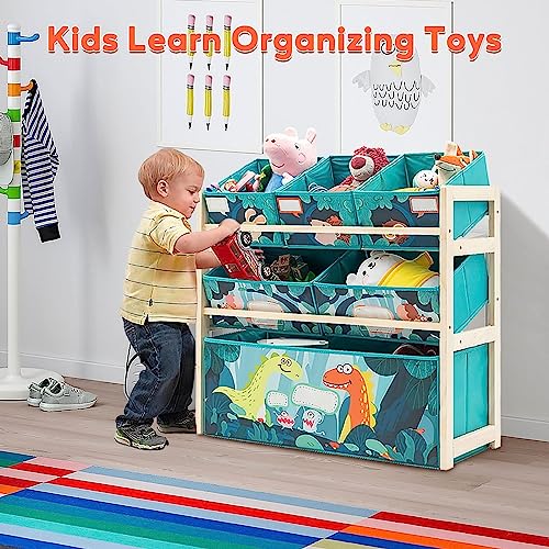 ROBUSTO E DUREVOLE: il nostro rack per giocattoli in legno di dinosauro realizzato con legno robusto e contenitori in tessuto resistente, che garantiscono la capacità di peso di 20 libbre per livello.