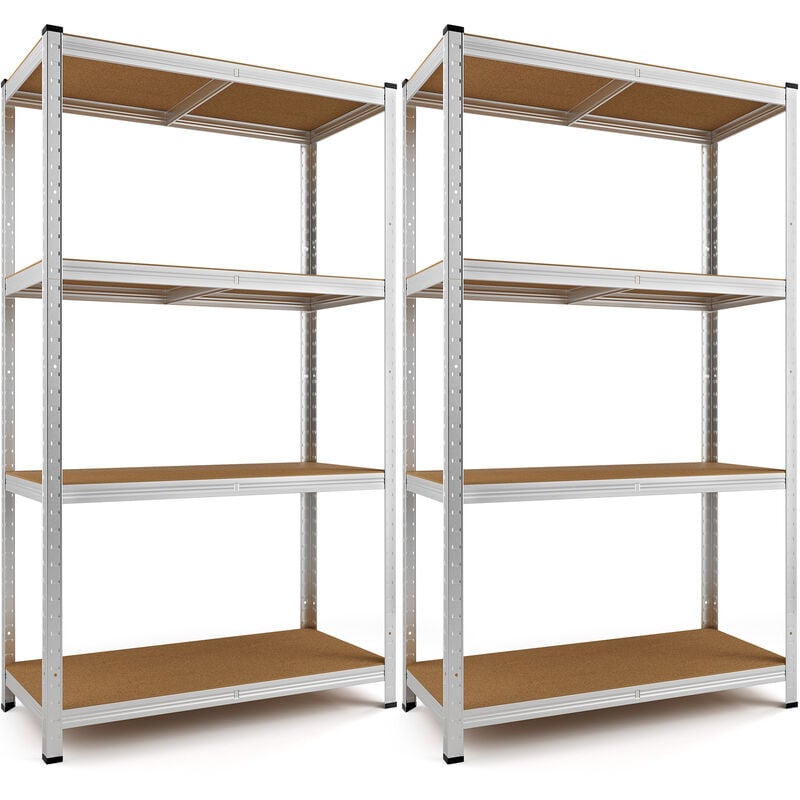 I due scaffali hanno chiascuno 4 ripiani in MDF (fibra a media densità). La capacità di carico per ripiano è 175 kg (ogni scaffale 700 kg) Vantaggi del prodotto: Scaffale in metallo Sistema a innesto Adatto per fisaggio in muro Barre traversali per megliore stabilità Realizzato in metallo zincato 4 ripiani in MDF (fibra a media densità) Altezza dei livelli variabile Capacità di carica per ripiano: 175 kg (con carico distribuito uniformemente) Capacità di carica totale: fino a 700 kg (con carico distribuito uniformemente) Versatilità: si può trasformare in tavolo da lavoro Dati tecnici: Dimensioni (AxLxP): 160cm x 90cm x 40 cm Peso 10,5kg 4 ripiani Materiale ripiani: MDF(fibra a media densità) Materiale telaio: Metallo zincato Capacità di carico per ripiano: 175 kg (con carico distribuito uniformemente) Capacità di carico totale: fino a 700 kg (carico distribuito uniformemente) Contenuto della confezione: 2x scaffale. Ogni scaffale contiene: 8x piedini in plastica 4x ripiani MDF 10x