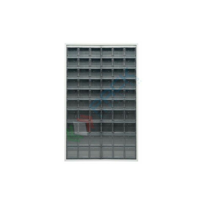 SCAFFALE PORTAMINUTERIA CON 60 CASSETTI Scaffalatura in lamiera elettrosaldata, verniciato in polvere epossidica, con 60 cassetti, Mis. 1260 L x 250 P x 2000 H mm. Scaffale composto da 8 cassettiere Cod. Art. CRBOX-4S + 12 cassettiere Cod. Art. CRBOX-3S. Scaffale con cassettiere porta minuteria fornito già montato. Colore struttura grigio chiaro RAL 7035, cassettiere colore grigio scuro simile RAL 7016. Caratteristiche tecniche: Misura: 1260 L x 250 P x 2000 H mm Colore struttura: Grigio chiaro RAL 7035 Colore cassette: Grigio scuro RAL 7016 Capacità di carico: 340 Kg Capacità Lt: 128,4 Lt Temperatura di esercizio: - 50° + 150° C Lo scaffale è allestito con: 8 cassettiere 600 L x 200 P x 215 H mm, con 3 cassetti, colore grigio scuro - Capacità singolo cassetto 2,5 Lt / 13 Kg (Cod. Art. CRBOX-4S) 12 cassettiere 600 L x 155 P x 175 H mm, con 3 cassetti, colore grigio scuro - Capacità singolo cassetto 1,9 Lt / 13 Kg (Cod. Art. CRBOX-3S) Per un totale di 60 cassetti