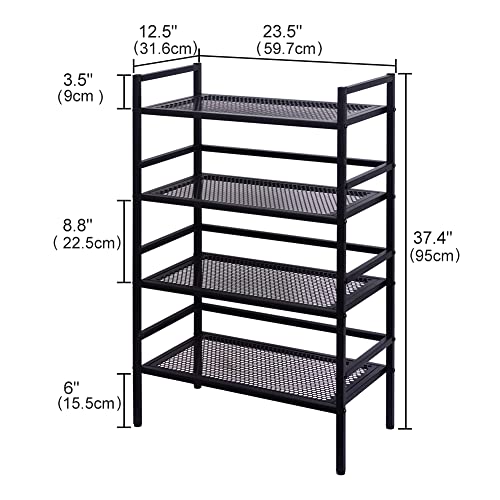 Robusto e durevole: la scaffalatura a 4 ripiani è realizzata in metallo resistente e finitura rivestita di nero, ha un'eccellente resistenza alla ruggine e alla corrosione, anche facile da pulire. Ogni strato può sopportare 30 kg, peso totale 120 kg. Questo scaffale offre una soluzione di stoccaggio a lungo termine.