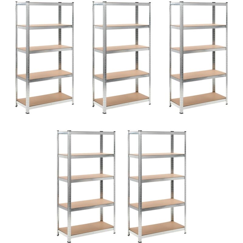 Questo set di 5 scaffali di stoccaggio di alta qualità è la soluzione ideale per stoccaggio a casa a nei spazi commerciali ed offre tanto spazio per poter tenere le cose in ordine.Questo scaffale può essere montato orizzontale o verticale, secondo i tuoi bisogni.Lo scaffale è realizzato in MDF di alta qualità e sostenuto da un telaio resistente in acciaio. Ha una capacità di carico di 265 Kg per ripiano (peso distribuito in modo uniforme), quindi la capacità totale di uno scaffale è di 1325 Kg.Grazie alla finitura zincata, lo set di scaffali è resistente alla corrosione e molto durevole. Materiale: acciaio zincato + MDF Dimensioni scaffale: 90 x 45 x 180 centimetri (L x P x A) Capacità totale per scaffale: 1325 kg (265 kg per ripiano) include 5 pz