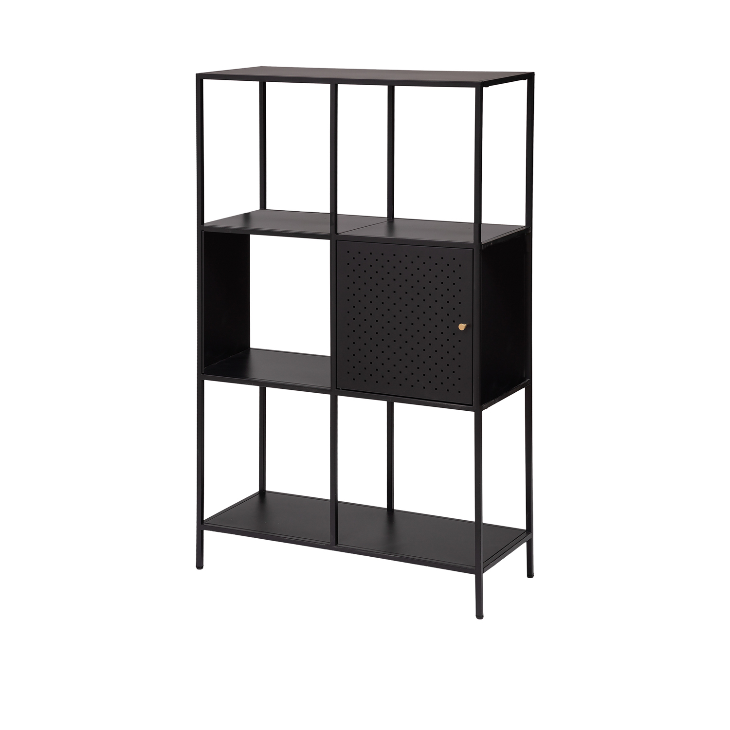 Valorizza l'ambiente di casa o dell'ufficio ed organizza con cura e stile libri, documenti e decorazioni con il bellissimo scaffale Nelia. Il suo design industriale, costruito interamente in acciaio verniciato di nero, ha un'eleganza originale capace di adattarsi ad ogni ambiente e stile, aggiungendo un tocco di pura unicità. Agli scomparti aperti in cui è suddiviso se ne accompagna uno chiuso da un'anta in lamiera forata, abbellita da un piccolo pomello color ottone. Usa questo mobile per esprimere la tua attenzione ai dettagli ed il tuo gusto unico. Dimensioni: 80x137,7x35 cm.