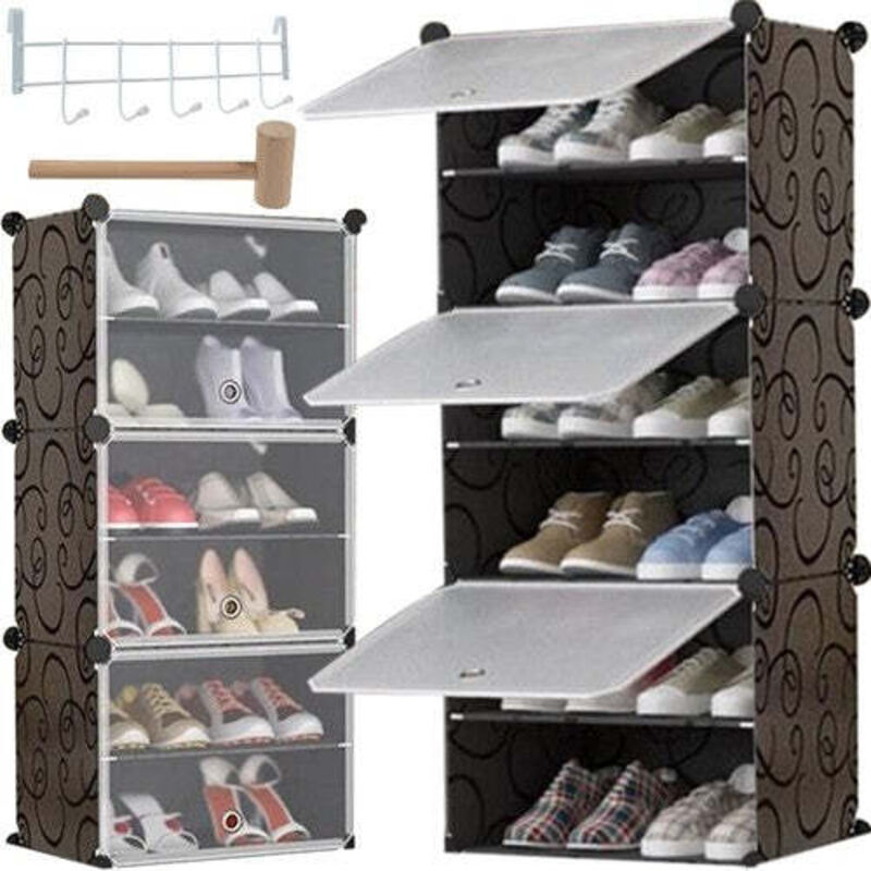 Scaffale per scarpe composto da tre moduli con due ripiani ciascuno. Il design modulare ti consente di montare la mensola per scarpe come desideri. Le ante trasparenti assicurano che le scarpe siano protette da polvere e sporco, rimanendo allo stesso tempo visibili. È incluso un martello per un facile montaggio. - Scaffale per scarpe componibile - Sei ripiani - Ante trasparenti Specifiche: Colore: nero, trasparente Materiale: plastica Dimensioni: 92 x 40 x 31 cm La confezione contiene: 3 moduli 1x martello