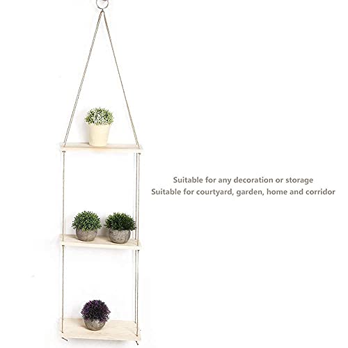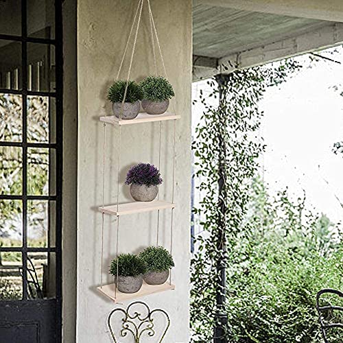 Scaffale Sospeso a Parete Corda Portafiori in Legno Corda da Giardino Scaffale Portaoggetti Sospensione Scaffale per Libri Organizzatore Galleggiante Vintage Decorazioni per la Casa(Tre Livelli)