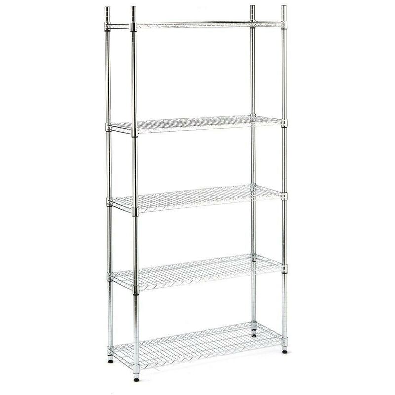 Kit scaffali in metallo cromato con misure 90x35x180 h con diametro pali di appoggio da 25 mm ogni ripiano ha una portata massima di 75 Kg. Design semplice, stabile e pratico si adatta ad ogni tipo di arredo interno della casa. Mobile con ripiani adatto per uso interno dentro un magazzino, un'officina, un ripostiglio o nel garage. Mobile a giorno in metallo con ripiani che consente di mettere in ordine libri, utensili ed attrezzi della casa, consentendo di sfruttare lo spazio in altezza. Si consiglia il fissaggio a parete, per una maggiore sicurezza soprattutto dei bambini. Lo scaffale arriva da assemblare, montaggio semplice e veloce senza utensili. Caratteristiche Tecniche: Dimensioni (LxPxH) 90x35x180 Materiale: Metallo Cromato Spessore Pali di appoggio: 25 mm Portata ripiano: 75kg con carico uniformemente distribuito 5 ripiani Peso: 16.6 Kg