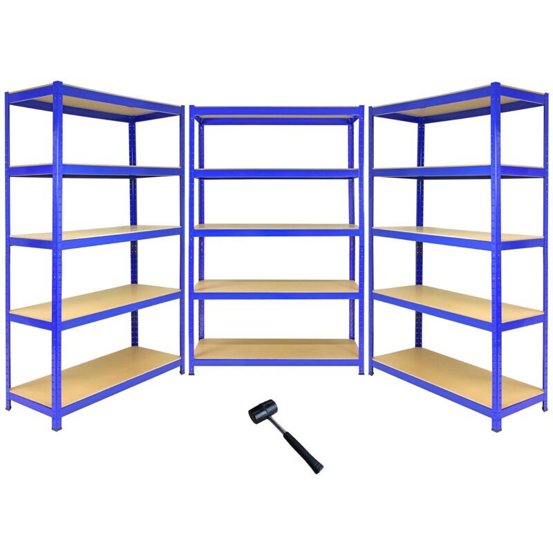Organizza il tuo spazio di lavoro con questi 3 scaffali blu Monster della gamma T-Rax Sono extra larghi, 100% senza bulloni, forti e ognuno misura 120cm (larghezza) x 45cm (profondità) x 180cm (altezza) Caratteristiche: 3 scaffali della gamma T-Rax per garage e officina con 5 ripiani Possono essere divisi a metà per creare ottimi piani di lavoro Solidi pannelli in MDF per tutti i ripiani Piedi modellati che forniscono extra stabilità Incredibile tolleranza di peso di 280kg per ripiano (se il peso è uniformemente distribuito) In acciaio resistente 1 martello di gomma GRATUITO