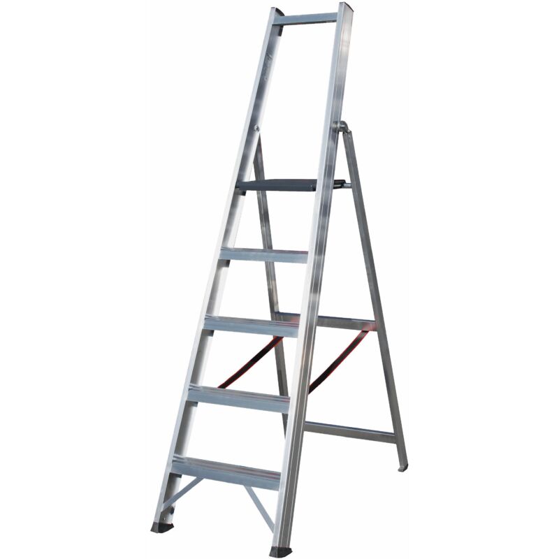 Scala alluminio 6 gradini professionale a cavalletto Frigerio SCA 6026/06 Una scala appositamente studiata per tutti gli impieghi su superfici pianeggianti. Realizzata per essere molto robusta e stabile, dispone di un comodo gradino largo e parapetto regolamentare con vaschetta portaattrezzi, garantisce alta funzionalità e la massima sicurezza anche all'utilizzatore meno esperto. Caratteristiche tecniche: Gradino anti-scivolo profondo mm. 83 unito al montante mediante robusta saldatura ad angolo nascosta alla vista Montante scatolato a doppia anima mm. 80x23 alettato Piattaforma in nylon 290x260 mm. con biella automatica di sicurezza anti-chiusura Grande vaschetta porta-oggetti in alluminio saldata di dimensioni cm. 8x34 e profonda 4 cm Parapetto di sicurezza alto cm. 61 Cintino in ndi sicurezza anti-divaricamento Base rinforzata anti-urto con nervature in alluminio anti-ruggine saldate sulla scala Piedini ad innesto anti-distacco maggiorati con superficie di appoggio anti-sdrucciolo