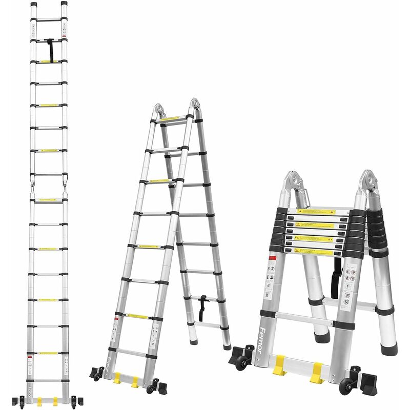 Comodo trasporto e stoccaggio - Ci sono 2 ruote nella parte inferiore della scala per un facile spostamento. Il funzionamento della scala telescopica è rapido e conveniente e può essere ampliato o chiuso premendo un pulsante. L'altezza piegata è un quarto dell'altezza completamente aperta. la scala misura 46x16x85 Cmquando è piegata. 【Tecnologia antiscivolo e anti-gancio】 Scala telescopica in alluminio lunghezza 5m. Robusto telaio e gradini antiscivolo, con una capacità di carico di 150 kg. Ogni distanza di connessione è calcolata con precisione per garantire espansione e contrazione uniformi senza jitter. 【Sicurezza】 Ha un meccanismo di bloccaggio, una cassaforte e un rivestimento in gomma antiscivolo sul fondo. La qualità migliorata (certificato CE) ne garantisce la stabilità alla massima apertura. 【Materiale eccellente】 realizzato in lega di alluminio resistente alla corrosione di alta qualità. Questa ha dimostrato di essere una struttura resistente alla ruggine e durevole.