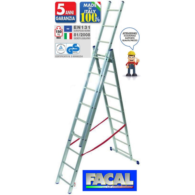 SCALA IN ALLUMINIO TRIPLICE TELESCOPICA FACAL 3 RAMPE X 9 GRADINI MT. 5,94 Scala telescopica FACAL professionale 9+9+9 (3 rampe da 9) con barra stabilizzatrice fissa. La scala si estende per una dimensione massima di 5,94 Mt (6,84 con operatore) Robusta ed ultra leggera grazie al materiale in alluminio. E' inoltre presente una fune anti-divaricamento che impedisce alla scala di aprirsi incidentalmente, e barra stabilizzatrice rendendola quindi molto sicura e la funzione aggiuntiva scala zoppa La scala è prodotta da FACAL Tutti i nostri prodotti sono provvisti di marcatura CE e sono conformi agli standard tecnici europei (norme europee armonizzate) Pioli 24x24 mm Passo tra gradini 280 mm Articolazioni in acciaio Funzione aggiuntiva di scala zoppa MADE IN ITALY Portata max 150 kg Altezza mt 2,58 (chiusa) - mt 4,86 (apertura a libro) - mt 5,94 completamente estesa (mt 6,84 con operatore)