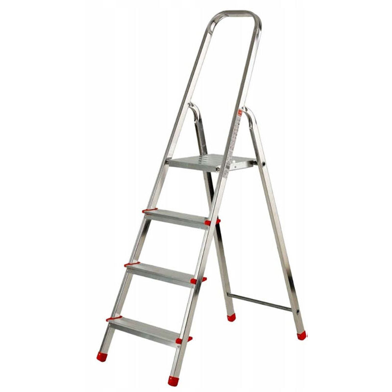 Scala domestica in alluminio Gierre Scala casalinga in alluminio, adatta per i lavori di piccola manutenzione in casa o all'esterno: cambiare una lampadina, appendere un quadro, riporre oggetti sopra a ripiani, riporre oggetti all'interno dei ripiani alti degli armadi, cambiare le tende, e tante altre ancora. Leggera e conveniente, è dotata di una comoda tasca porta utensili. Disponibile nei modelli dalla 5 gradini alla 8 gradini. Adatta per un uso domestico. Caratteristiche tecniche Prodotto certificato secondo la normativa EN131, rilasciata da un Ente abilitato europeo, portata garantita 150 kg. Struttura in alluminio con rinforzi posteriori per una maggiore sicurezza. Piattaforma in acciaio con blocco antiapertura. Gradino zigrinato da 81mm, è fissato con rivetto passante. Piedini antiscivolo zigrinati e fissati ai montanti, che assicurano la massima aderenza al terreno corda antiapertura. Copertura esterna del gradino antitaglio. Modello Codice h max Portata max 4 Scalini AL140 80