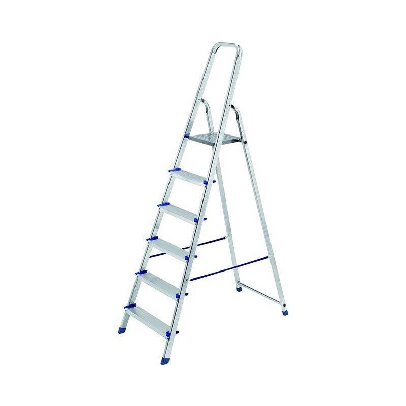 Scala in alluminio europiuma 6 gradini. gradini ribattuti, pianale e gradini antiscivolo, portata max 150 kg. materiale 100 % alluminio. paraspigoli in plastica.