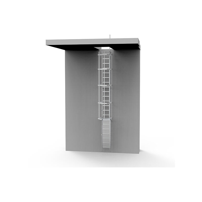 ACCESSO SICURO AL TETTO - Manutenzione dei tetti degli edifici: accesso esterno o interno - Manutenzione per l'accesso alle macchine nei siti industriali: controllo e riparazione di attrezzature di produzione, condotti tecnici, condizionamento dell'aria, ecc. - Accesso a serbatoi, cisterne e silos nei settori petrolchimico, alimentare, energetico, ecc. - Uscita di emergenza supplementare in caso di incendio - Ideale per accedere a una botola di estrazione dei fumi o a un pozzetto. MANIGLIA RETRATTILE - Scala a gabbia dotata di corrimano retrattile. - Il corrimano a scomparsa può essere utilizzato per bloccare e chiudere una porta o una botola. - Il corrimano è obbligatorio in caso di attraversamento del pavimento per rispettare la norma. PORTA DI SICUREZZA - Scala a gabbia dotata di una porta di chiusura. - Proibisce e impedisce l'accesso alla scala e al tetto da parte di persone non autorizzate. - Per proteggere l'accesso al tetto di un edificio. NORMA D.LGS 81/2008 - Scala a gabbia