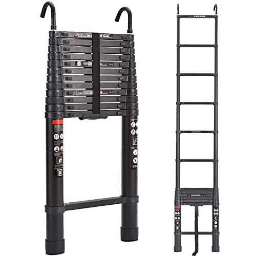 Sicurezza: questa scala telescopica è approvata con gli standard di sicurezza europei EN131 e SGS. I cappucci terminali antiscivolo tengono saldamente in posizione la scala. E con il gancio staccabile e il fermo scorrevole per ogni gradino che ti offrono più sicurezza durante il lavoro;