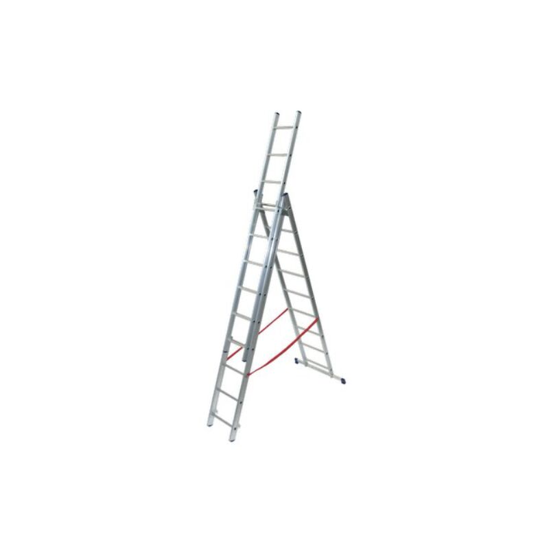 Scala parallela 3 rampe stilo facal Alluminio en 131 h.cm 301/706 pioli 3x11 scala a 3 elementi in alluminio. pioli zigrinati antisdrucciolo con sezione da mm. 24×24. barra stabilizzatrice, cinghie antiapertura. cerniera in acciaio. dispositivo di blocco tronchi. portata massima kg. 150. rispondente alla normativa europea en 131 ed al d. lgs 81/2008 art. 113. indicate per operatori sia professionali che privati.