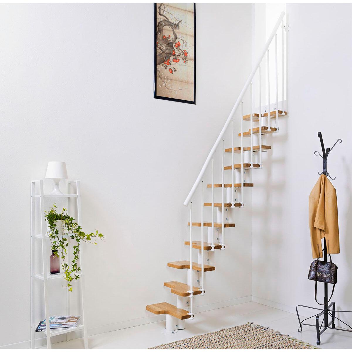 Oak30 è una scala salvaspazio dalle finiture eleganti, ideale per l'arredo dei piccoli spazi di casa con una soluzione comoda, resistente e di design. La struttura è in acciaio verniciato, con gradini in legno massello rovere tinta naturale. La ringhiera è composta da colonnine verticali in acciaio verniciato, nello stesso colore delle colonnine. Il corrimano è in PVC con anima in alluminio.. Scala prefabbricata, facile da montare per chi ama fai da te.. Struttura snodabile, può essere orientata e regolata in base alle proprie esigenze. La soluzione ideale per chi ha bisogno di una piccola scala, con un design moderno e di alta qualità.. Eleganza e naturalezza grazie ai gradini in legno di rovere