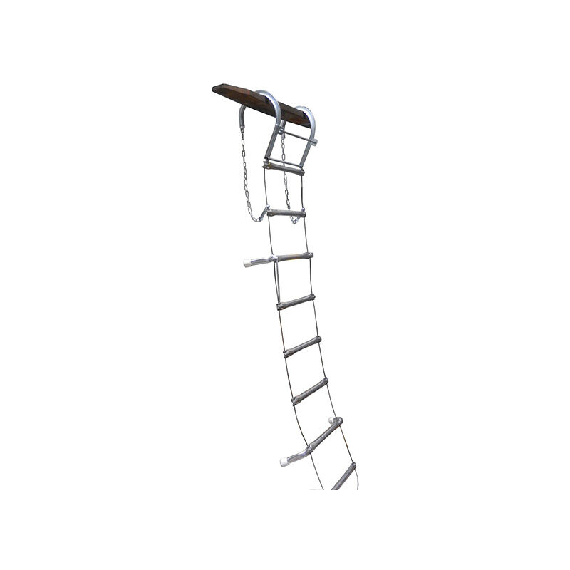 USO - Scala di emmergenza in inox molto resistente ideale per un uso contro il muro. - Da fissare in modo permanente, la scala puo' essere fissata in un punto preciso arrotolata per limitarne lo spazio d'ingombro. - Uso professionale in ambiente aziendale: operatori di fabbrica, industria, ingeniere... - Il lucchetto permette di srotolare la scala in modo veloce e sicuro. - La scala permette l'evaquazione di un luogo in modo veloce e sicuro per mezzo di muri, facciate... - Comoda da usare e con una maggiore stabilità grazie ai gradini con distanziatori dal muro. - Limita il rischio di cadute e permette di evaquare una zona in tutta sicurezza. CARATTERISTICHE - Rampe in cavo inox Ø 5 mm. - Pioli da Ø 30 mm dentellati antidirapanti in alluminio. - Larghezza esteriore della scala 380 mm e larghezza dei pioli 350 mm. - Larghezza esteriore del distanziatore dal muro di 600mm con boccaglio in plastica nero. - Interasse tra i distanziatori dal muro di 1000mm. - Ganci d'ancoraggio superiori