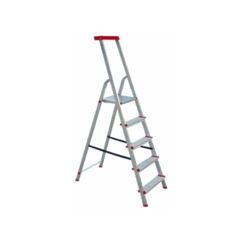 Scala in alluminio per uso domestico con piattaforma in acciaio zincato e telaio in tubi quadri. Ha un bloccaggio di sicurezza per evitare l'apertura involontaria della scala. Caratteristiche: Spigoli con protezioni in plastica Piano superiore con bloccaggio di sicurezza Gradini antiscivolo Cavetto di rinforzo Arco superiore con vaschetta portaoggetti e gancio porta secchio rimovibile Portata max kg. 150 Rispetta la norma di sicurezza EN 131 Gradini 6
