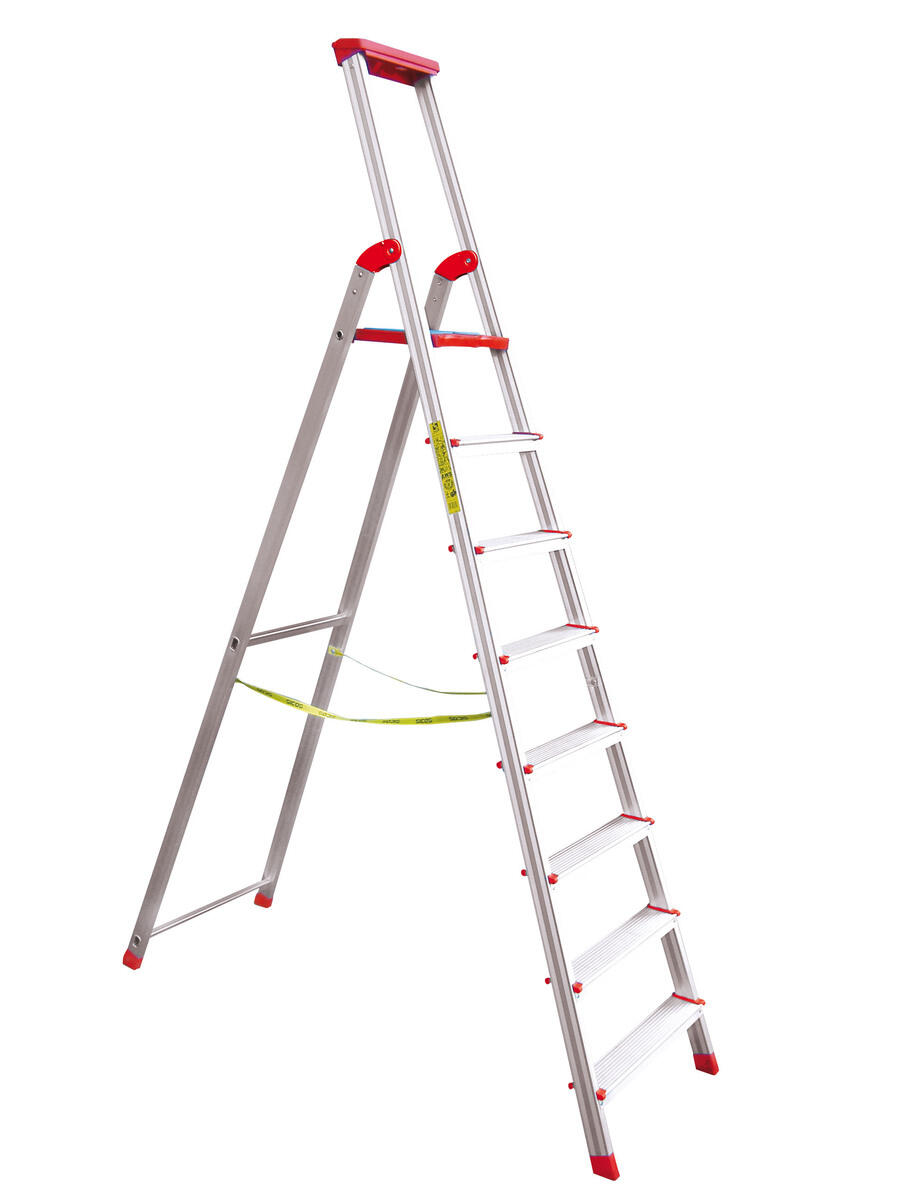 Professionale a 8 gradini in alluminio estruso a un lato di salita.. Dotata di comoda vaschetta porta utensili con gancio porta secchio. Piano ergonomico brevettato SICOS in materiale plastico alto resistenziale e gomma antisdrucciolo. Sezione profilo montante 51x20 mm. Sezione gradino 80 mm. Portata 150 kg. Normativa europea EN 131.