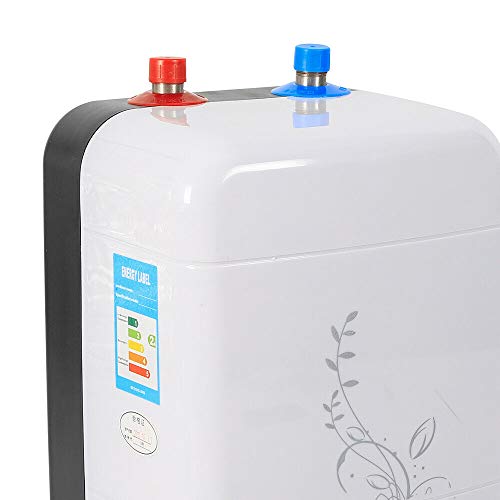 Scaldabagno elettrico compatto, aspetto bianco alla moda. Installato sotto il lavandino. Scaldabagno da 8 litri con grande capacità. Acqua calda istantanea, temperatura dell'acqua regolabile tra 30 - 75 ℃. Ingresso acqua fredda separato (blu), uscita acqua calda (rosso).