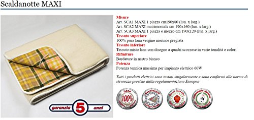 Scaldanotte MAXI copre tutto il materasso LANCALOR Made in Italy 100% Lana Vergine Merinos Garanzia 5 Anni (1 PIAZZA E MEZZA (190cm x 120cm))