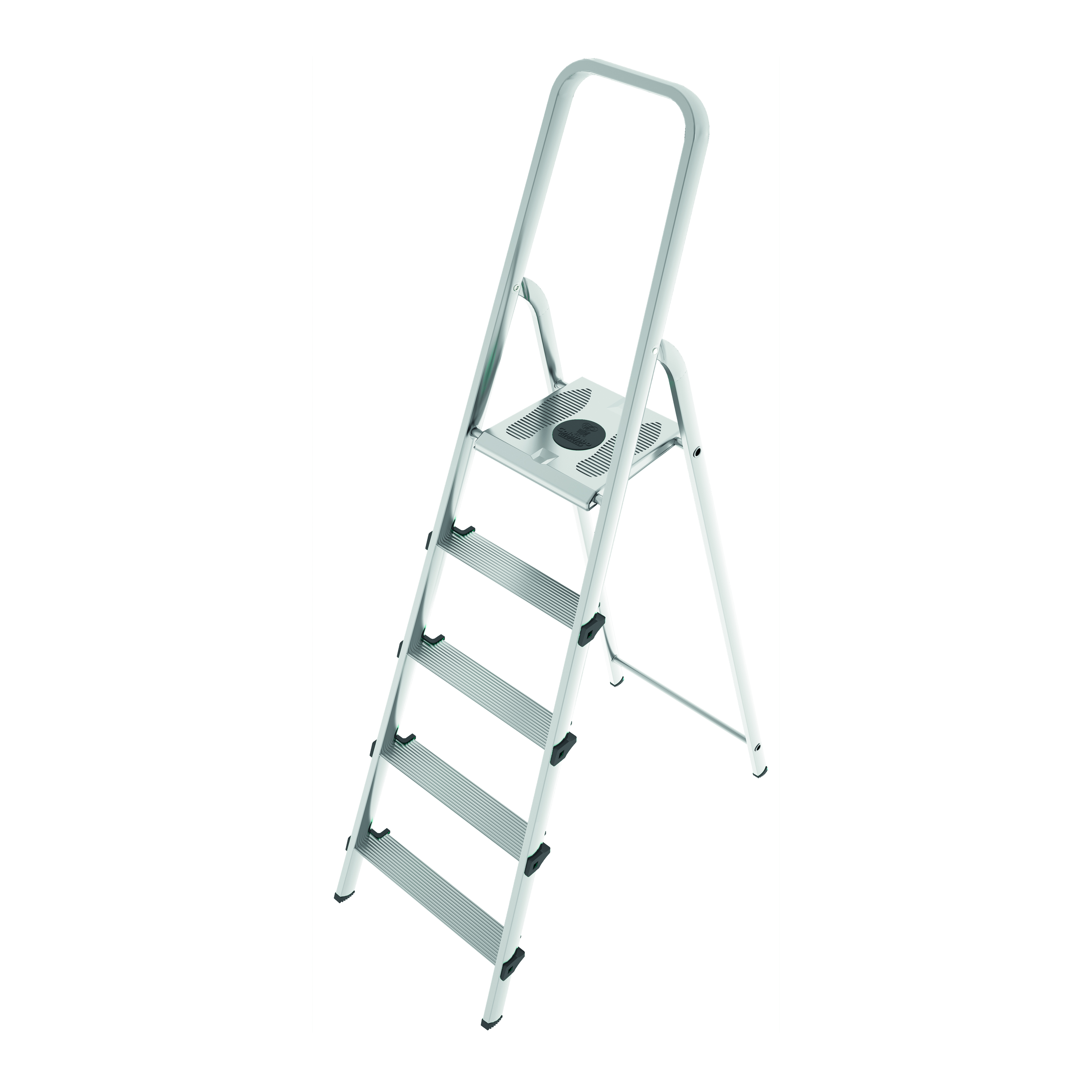 Scala a 5 gradini, telaio super resistente in acciaio zincato e gradini in alluminio. A norma EN131, portata massima 150Kg, certificata TUV-GS. Stabile e sicura, Super sicura (a norma EN131 e certificata TUV-GS). Massima stabilità. Minimo ingombro