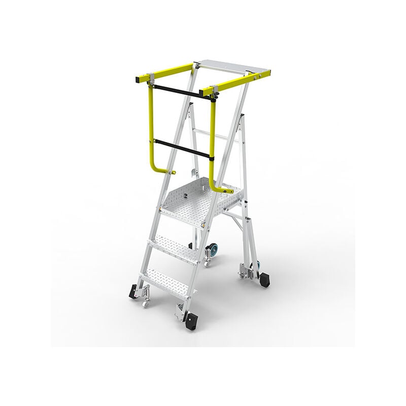 USO - La scalaletta è stata progettata appositamente per lavorare sugli scaffali o sulle gondole degli ipermercati. - Attrezzatura ideale per il picking, la scaffalatura e e il posizionamento dei prodotti in negozi di grandi e medie dimensioni o in negozi specializzati. - Piattaforma mobile sicura per il lavoro degli addetti alle grandi superfici. - Ottimizzare le scaffalature, l'esposizione e il picking - Attrezzatura ideale per supermercati, magazzini, piattaforme logistiche per inventari o operazioni di facciata. FACILE DA SPOSTARE - Scaletta dotata di 2 ruote non portanti Ø 125mm sul retro per spostare facilmente la scaletta ripiegata. - Scaletta con 4 ruote retrattili Ø 50 mm che consentono una rotazione di 360° e di lavorare da un ripiano all'altro senza sforzo. LAVORO IN SICUREZZA - Parapetto laccato che impedisce all'operatore di cadere e non sporca le mani per un ambiente di lavoro pulito. - Zoccoli che impediscono all'operatore di scendere dalla piattaforma o di far cadere