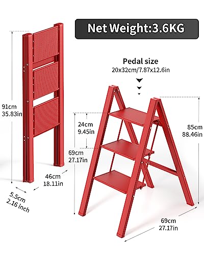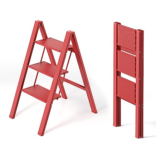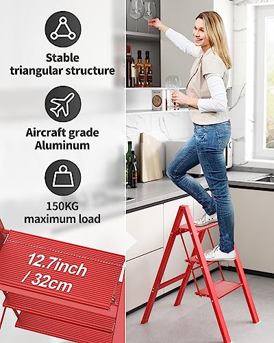 Scaletta 3 Gradini di Pieghevole Scala In Alluminio Antiscivolo e Robusto Gradini Larghi Portata massima 150kg Sgabello Portatile E Leggero Casa e Cucina (Rosso)