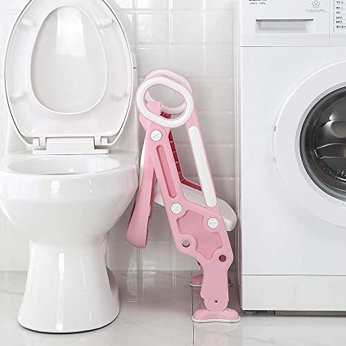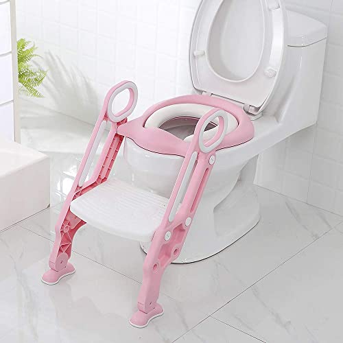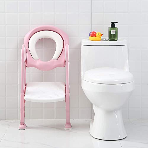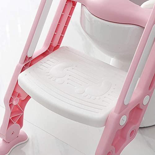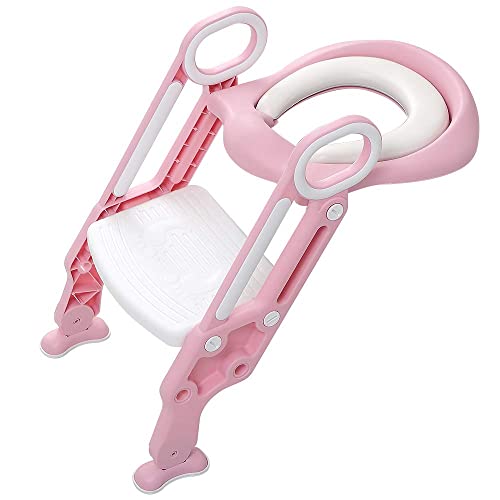 Scaletta Gradini Vasi Riduttore WC per Bambini, Sedile Imbottito, Gradini Antiscivolo con Maniglia, per 1-8 Anni (Rosa+bianco)