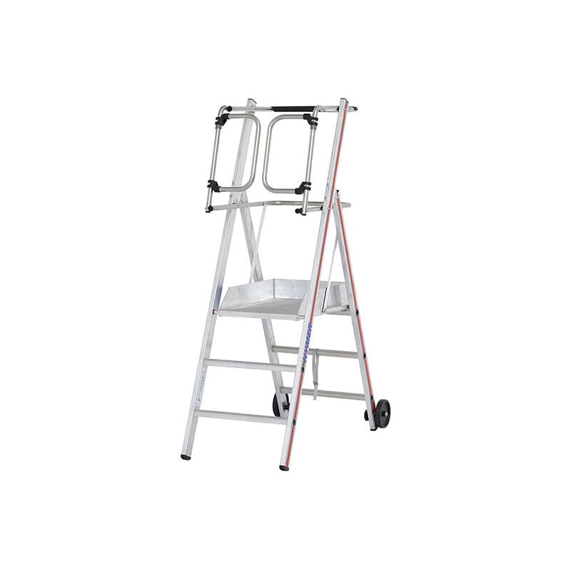 TRASPORTO / STOCCAGGIO / TRASLOCO - Scaletta a palchetto pieghevole che entra in un veicolo utilitario - Scaletta a palchetto che si muove come una carriola: facile da trasportare LAVORARE IN SICUREZZA - Parapetto per evitare che l'operatore cada. - Zoccoli che impediscono all'operatore di scendere dalla piattaforma o di far cadere gli attrezzi. - Stabilizzatori laterali per evitare il rischio di ribaltamento. CARATTERISTICHE - Stabilizzatori telescopici che possono essere regolati di mm o retratti per adattarsi a spazi ristretti: corridoi, corsie, ecc. - Scaletta a palchetto che si muove come una carriola: facile da trasportare e da far passare attraverso le porte (larghezza massima 70cm). - Gradini antiscivolo profondi 5cm, portautensili regolabile a 2 altezze diverse. - Numero di gradini compresa la piattaforma PARAPETTO CON CANCELLETTO SALOON - Accesso e lavoro sicuri: il cancello del salone si chiude automaticamente al passaggio dell'utente. - Non è necessario agganciare una