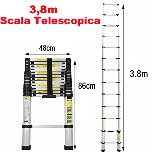Scaletta Telescopica Alluminio con 13 Gradini, Scala Allungabile 3,8 Metri, Scala Portatile e Leggera, Forte e Stabile, Multiuso, Portata 150 kg, Norma EN131
