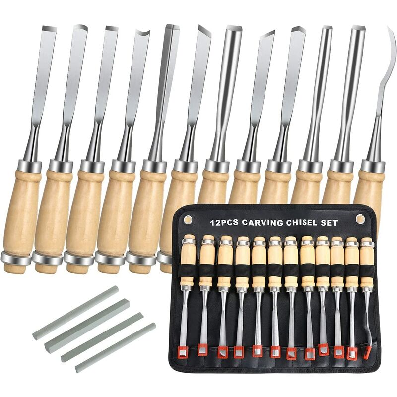 IL PACCHETTO COMPRENDE - : Riceverai 12 tipi di scalpelli per legno e 4 pietre per affilare, scalpello profondo, scalpello medio, scalpello poco profondo, scalpello dritto stretto, scalpello dritto largo, scalpello rotondo, 4 taglierine/scalpelli angolari, uno strumento di troncatura, uno strumento di posizionamento di precisione, adatto per la maggior parte dei lavori di incisione. 【ALTA QUALITÀ】: questo set di scalpelli per legno è realizzato in acciaio temprato. Il manico è realizzato in legno lucidato di alta qualità per una presa comoda. Il giunto tra la lama e il manico è appositamente rinforzato per evitare che cada, il che rende l'intaglio del legno più durevole. 【SICURO E PORTATILE】: ogni scalpello ha un coprilama indipendente, che può evitare accidentali lesioni o graffi quando porti una forbice da solo. 【DESIGN ERGONOMICO】: il design dell'impugnatura adotta un design ergonomico per farti sentire più a tuo agio. L'anello metallico all'estremità del manico ne permette la