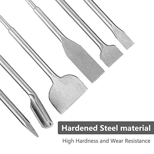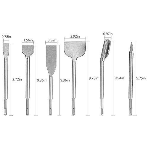 Set sei in uno: Questo set di scalpelli per trapano a percussione SDS plus contiene un totale di 6 punte da trapano di diverse dimensioni, uno scalpello a punta, uno scalpello a fessura e 4 scalpelli piatti, che possono soddisfare i tuoi diversi scopi.