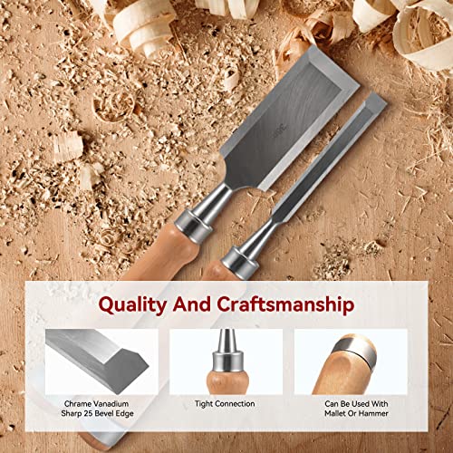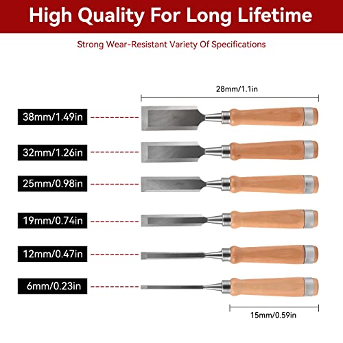 【Set di scalpelli per legno da 6 pezzi】 Il nostro set di scalpelli per legno include: scalpelli da 6 mm, 12 mm, 19 mm, 25 mm, 32 mm, 38 mm, perfetti per i principianti o per coloro che hanno bisogno di sostituire o aggiornare la loro attrezzatura attuale. L'elegante scatola in legno retrò non solo protegge la tua attrezzatura per intagliare il legno, ma ti aiuta anche a trasportarla facilmente.